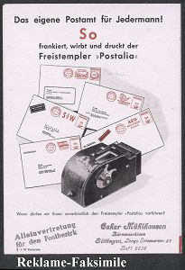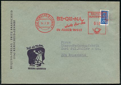 10361 | 16 € | 5630 REMSCHEID : (22a) REMSCHEID-LENNEP/ BE-QU-NA/ Wirbt für Sie/ IN ALLER WELT 1951 (14.3.) AFS Postalia "Posthorn" auf 2 Pf. NoB (= Vorausentwertung) Reklame-Bf.: BEQUNA VERLAG FRITZ BRANSCHEIDE, Nur ein Tasten ohne BEQUNA-ADRESSEN (vergl. Kat,-Nr. 10351 + Postalia-Faksimile (Dü.E-23 B) | ![]() ![]() | |