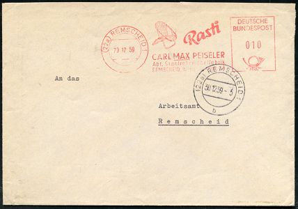10383 | 15 € | 5630 REMSCHEID : (22a) REMSCHEID 1/ Rasti/ CARL MAX PEISELER/ Abt.Stahlrohmöbelfabrik 1959 (29.12.) AFS Postalia (Motiv: Stahlrohrsessel) + 2K-Steg: (22 a) REMSCHEID 1/b vom 30.12. = postamtl. Datums-Korrektur!, rs. Abs.-Vordruck, Orts-Bf. (Dü.E-23 B) | ![]() ![]() | |