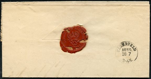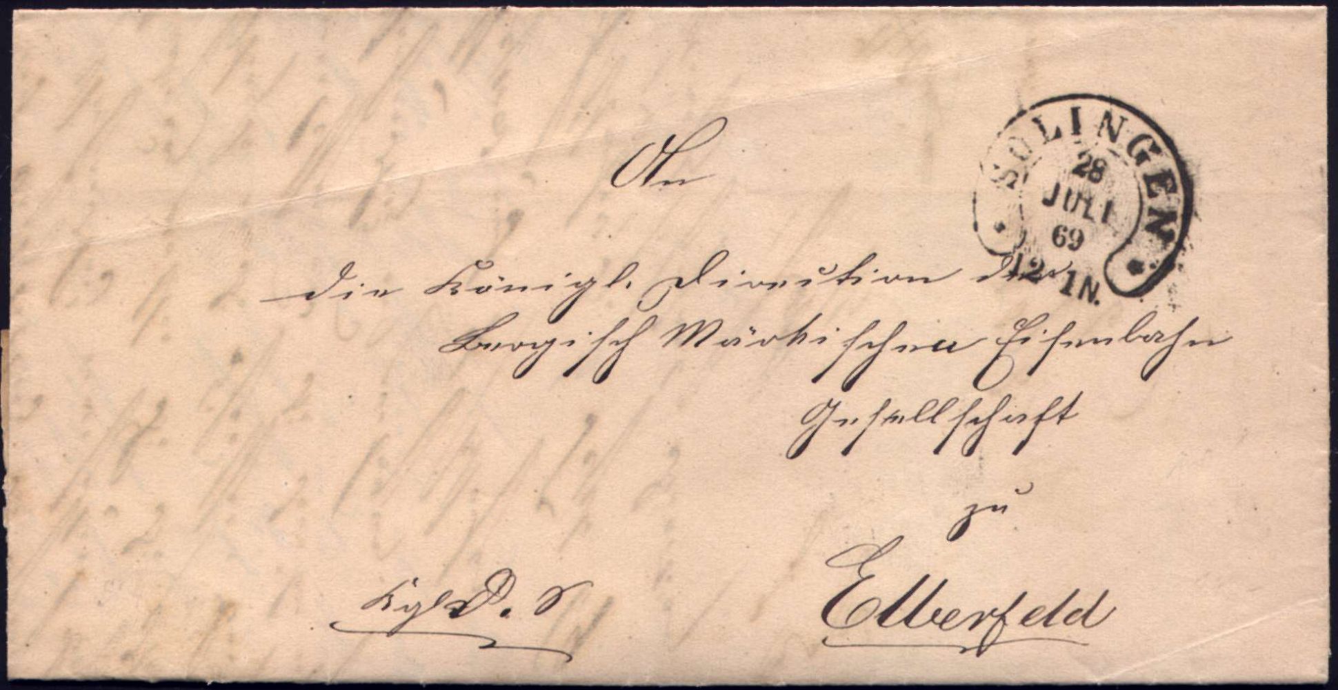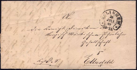 10404 | 28 € | 5650 SOLINGEN (Allgem. Abteilung, Tagesstempel, Sonder- und Maschinenstempel etc.) : *SOLINGEN* 1869 (28.7.) schwarzer H u f e i s e n - Stempel klar auf portofreiem Dienst-Faltbf., h.s. "Kgl D.S." = Königl. Dienst-Sache an Märk. Eisenbahn-Ges., Elberfeld (AS) mit Inhalt (Feu.3107, gepr. Spalink) | ![]() ![]() | |