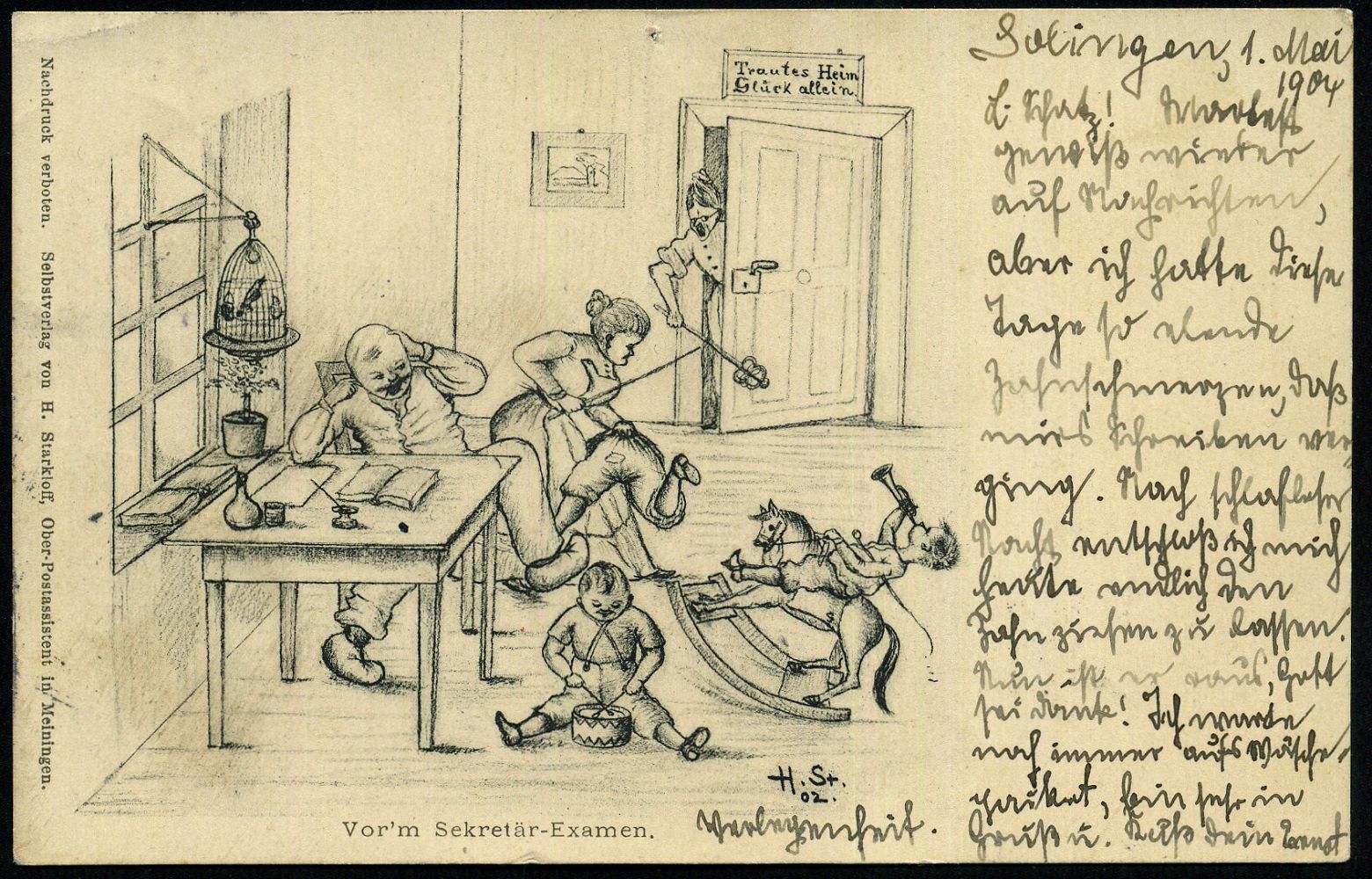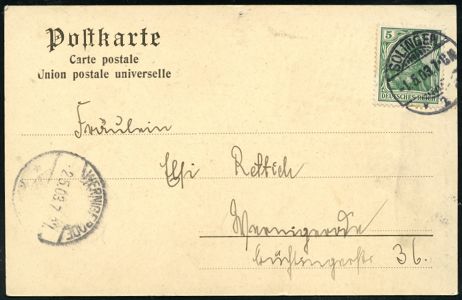 10405 | 15 € | 5650 SOLINGEN (Allgem. Abteilung, Tagesstempel, Sonder- und Maschinenstempel etc.) : SOLINGEN 1 1903 (1.5.) 1K-Gitter (rechts nicht ganz voll) auf Humor-Künstler-Ak.: "Vor´m Sekretär-Examen" = angehender Postsekretär mit lärmenden Kindern u. Ehefrau, sign. "H. St." (arkloff) , Bedarf | ![]() ![]() | |