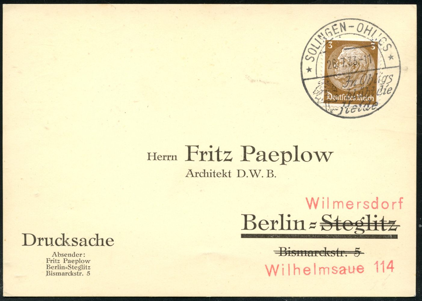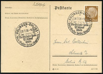 10406 | 16 € | 5650 SOLINGEN (Allgem. Abteilung, Tagesstempel, Sonder- und Maschinenstempel etc.) : *SOLINGEN-OHLIGS*/ In Ohligs/ blüht die/ Heide 1933 (26.7.) HWSt (Baum) klar auf Inl.-Drs.-Karte (Bo.2 Ty.I = * * , Erstjahr) | ![]() | |