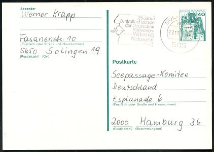 10408 | 6 € | 5650 SOLINGEN (Allgem. Abteilung, Tagesstempel, Sonder- und Maschinenstempel etc.) : 565 SOLINGEN 1/ mc/ 25 Jahre/ Zentralfachschule/ der Deutschen/ Süßwaren-/ Wirtschaft 1978 (27.11.) MWSt (Lippen-Profil) Bedarfs-Kt. | ![]() | |