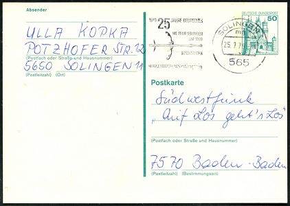 10409 | 6 € | 5650 SOLINGEN (Allgem. Abteilung, Tagesstempel, Sonder- und Maschinenstempel etc.) : 565 SOLINGEN 1/ mc/ 25 JAHRE DEUTSCHES/ ME FECIT SOLINGEN/ UM 1600/ BIDENHÄNDER.. 1979 (25.7.) MWSt = Bidenhänder (Schwert), Bedarfs-Kt. (Bo.48 A, nur vom 1.7. - 1.10.1979 verwendet) | ![]() | |