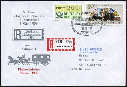 10410 | 18 € | 5650 SOLINGEN (Allgem. Abteilung, Tagesstempel, Sonder- und Maschinenstempel etc.) : 5650 SOLINGEN 1/ 50 JAHRE TAG DER BRIEFMARKE.. 1986 (16.10.) SSt auf 80 Pf. "Tag der Briefmarke" + 200 Pf. ATM, gedruckter Sonder-RZ: 5650 Solingen/* m l, klar gest. Inl.-R-Sonderumschlag: 50 Jahre ´Tag der Briefmarke (Mi.1300 etc.) | ![]() | |