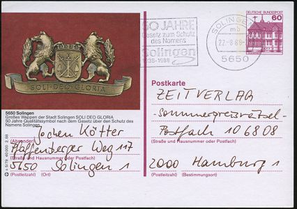 10411 | 14 € | 5650 SOLINGEN (Allgem. Abteilung, Tagesstempel, Sonder- und Maschinenstempel etc.) : 5650 SOLINGEN 1/ mb/ 50 JAHRE/ Gesetz zum Schutz/ d.Namens/ Solingen.. 1988 (22.8.) MWSt auf ortsgl. BiP 60 Pf. Burgen: 5650 Solingen.. 50 Jahre Qualitätssymbol .. Schutz d. Namens Solingen (Mi.P 138) Bedarf, seltene Kombination! (Mi.P 138/s 5/79) | ![]() | |