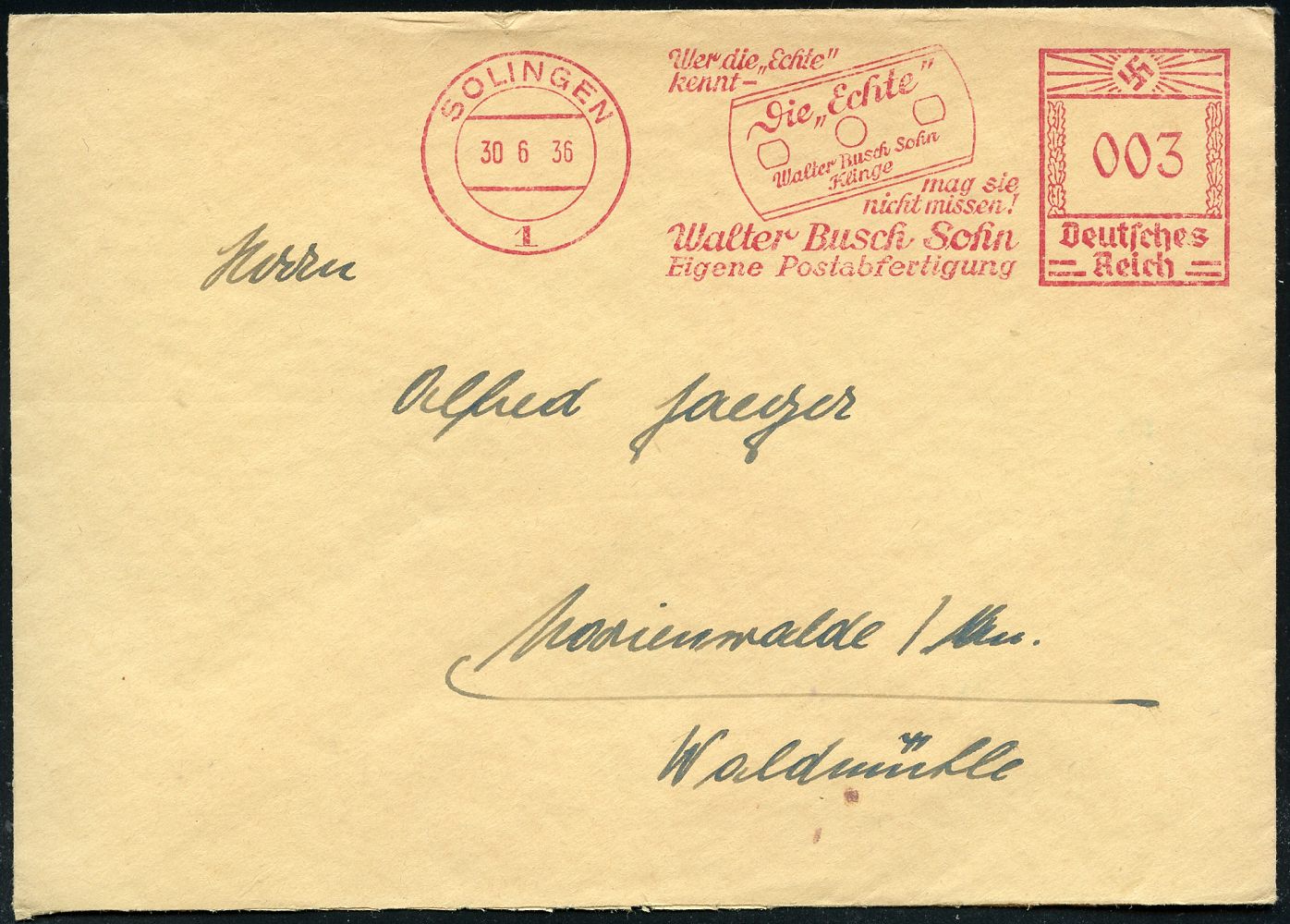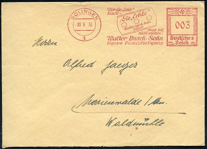 10416 | 20 € | 5650 SOLINGEN (Post- und Absender-Freistempel) : SOLINGEN 1/ Wer die "Echte"/ kennt../ Walter Busch Sohn/ Eigene Postabfertigung 1936 (30.6.) AFS Francotyp "Hakenkreuz" = Rasierklinge , klar gest. Fern-Bf. (Dü.E-3CEo) | ![]() | |