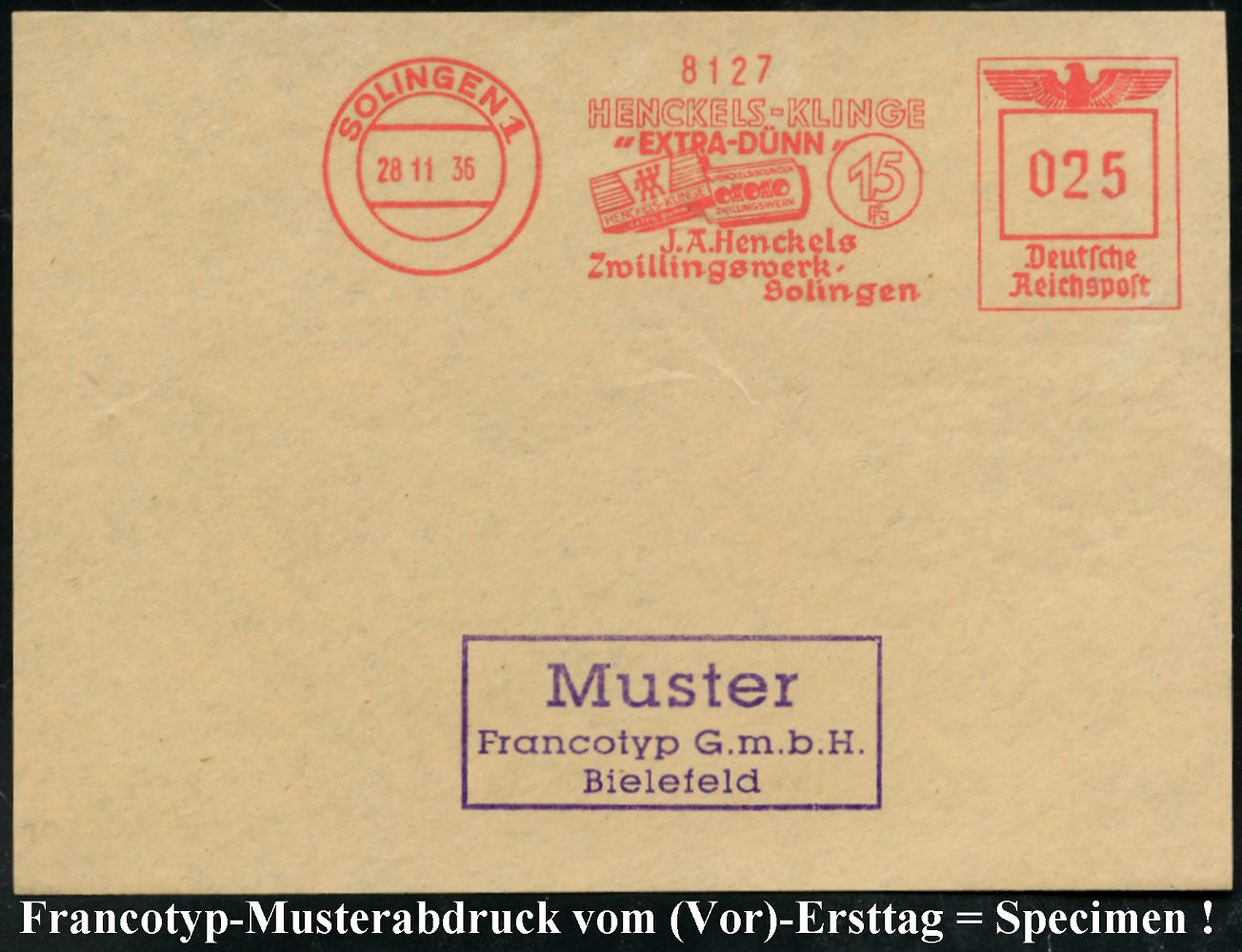 10417 | 35 € | 5650 SOLINGEN (Post- und Absender-Freistempel) : SOLINGEN 1/ HENCKELS-KLINGE/ "EXTRA-DÜNN"/ J.A.Henckels/ Zwillingswerk.. 1936 (28.11.) AFS-Musterabdruck Francotyp "Reichsadler" (Motive: 2 Rasierklingen) glasklar gest. Francotyp-Musterblatt vom (Vor)-Ersttag !, selten! (Dü.E-5CGh) | ![]() ![]() | |
