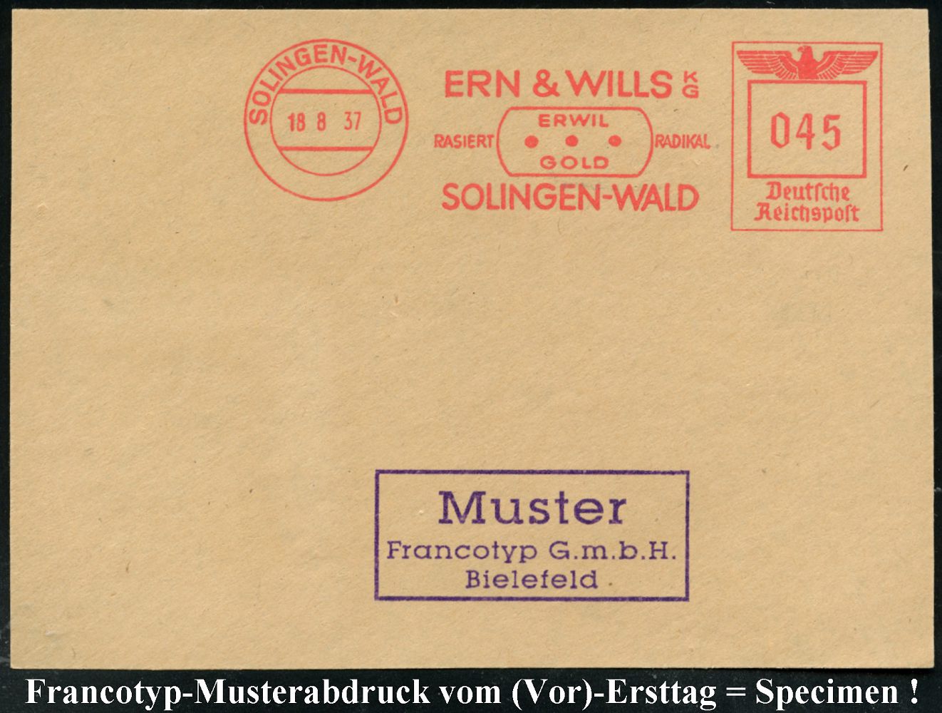 10418 | 35 € | 5650 SOLINGEN (Post- und Absender-Freistempel) : SOLINGEN-WALD&ERN & WILLS KG/ RASIERT RADIKAL.. 1937 (18.8.) AFS-Musterabdruck Francotyp "Reichsadler" (Rasierklinge) glasklar gest. Francotyp-Musterblatt vom (Vor)-Ersttag !, selten! (Dü.E-5CGo) | ![]() ![]() | |