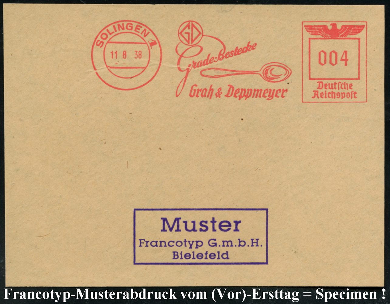 10419 | 35 € | 5650 SOLINGEN (Post- und Absender-Freistempel) : SOLINGEN 1/ GD/ Grade-Bestecke/ Grah & Deppmeyer 1938 (11.8.) AFS-Musterabdruck Francotyp "Reichsadler" (= Löffel) glasklar gest. Francotyp-Musterblatt vom (Vor)-Ersttag !, selten! (Dü.E-5CGo) | ![]() ![]() | |