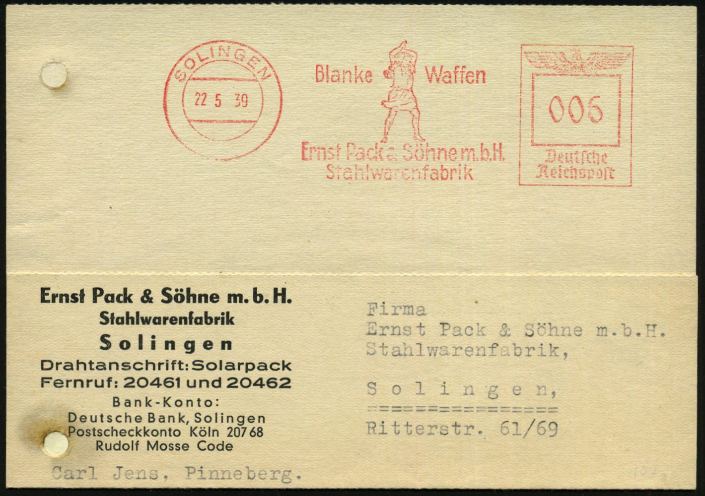 10420 | 18 € | 5650 SOLINGEN (Post- und Absender-Freistempel) : SOLINGEN/ Blanke Waffen/ Ernst Pack../ Stahlwarenfabrik 1939 (22.5.) AFS Francotyp "Reichsadler" = german. Gott Thor mit Schmiedehammer (ausholend) Firmen-Antwort-Kt. (Reg.-Lochung geschl., kl. Eckfleck) aus Pinneberg (Dü.E-5CE) | ![]() | |