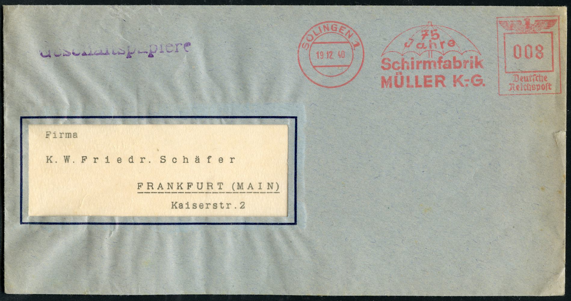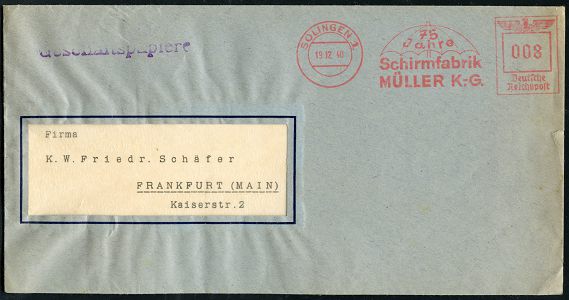 10421 | 20 € | 5650 SOLINGEN (Post- und Absender-Freistempel) : SOLINGEN 1/ 75 Jahre/ Schirmfabrik/ MÜLLER KG. 1940 (19.12.) Jubil.-AFS Francotyp "Reichsadler" 008 Pf. (= Schirm, Bf. rechts minim.Rißchen), Inl.-Bf. "Geschäftspapiere" (Dü.E-5CG) | ![]() | |