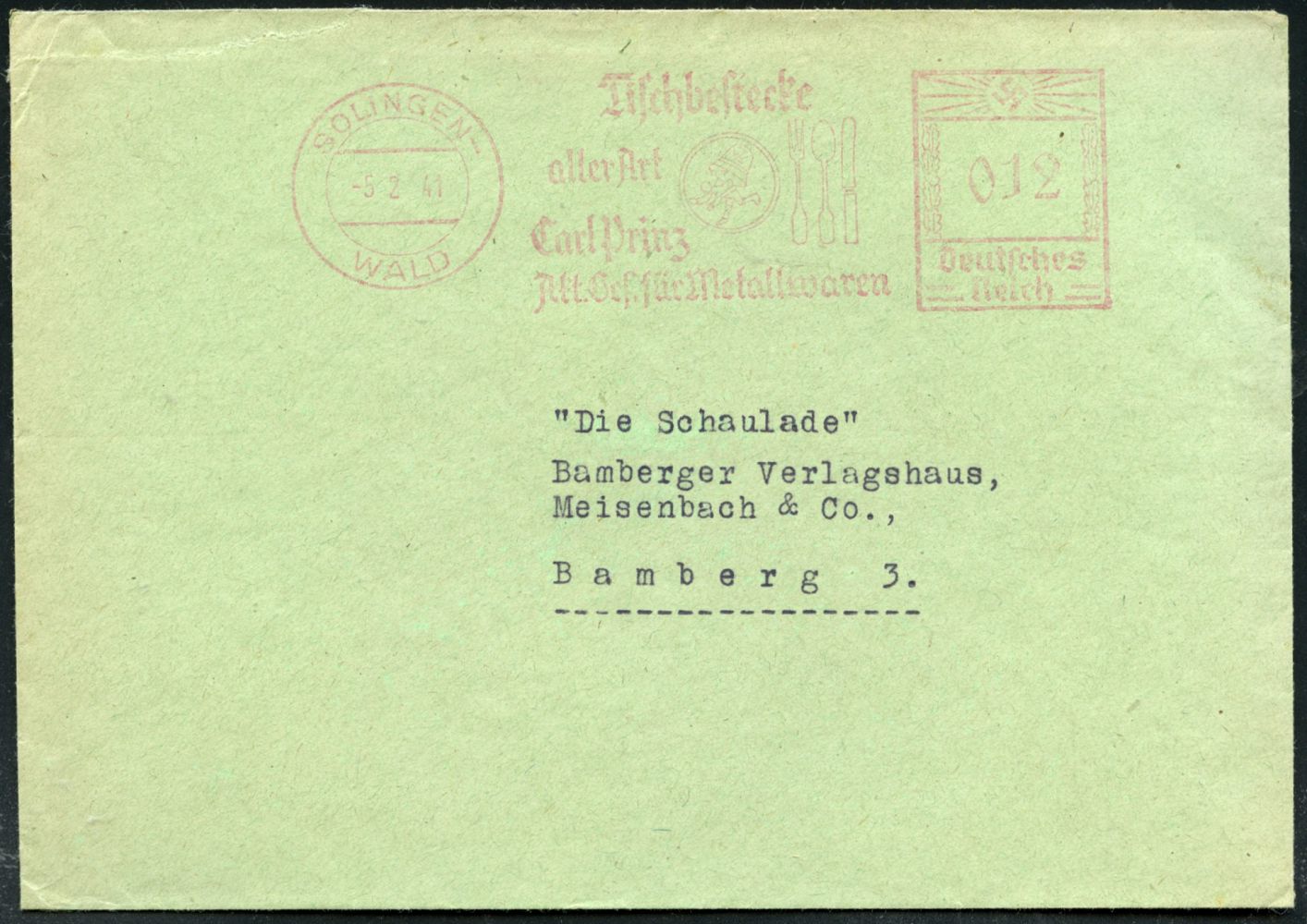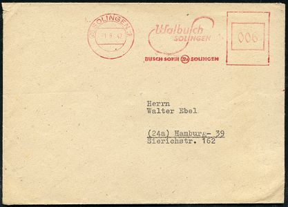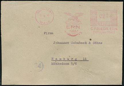 10422 | 18 € | 5650 SOLINGEN (Post- und Absender-Freistempel) : SOLINGEN-/ WALD/ Tischbestecke/ aller Art/ Carl Prinz/ Akt,.Ges, für Metallwaren 1941 (5.2.) AFS Francotyp "Hakenkreuz" (Logo mit Glocke u. Besteck) Inl.-Bf. (gr. Riß geschl.) n. Hambg. (Dü.E-3CEo) | ![]() | |