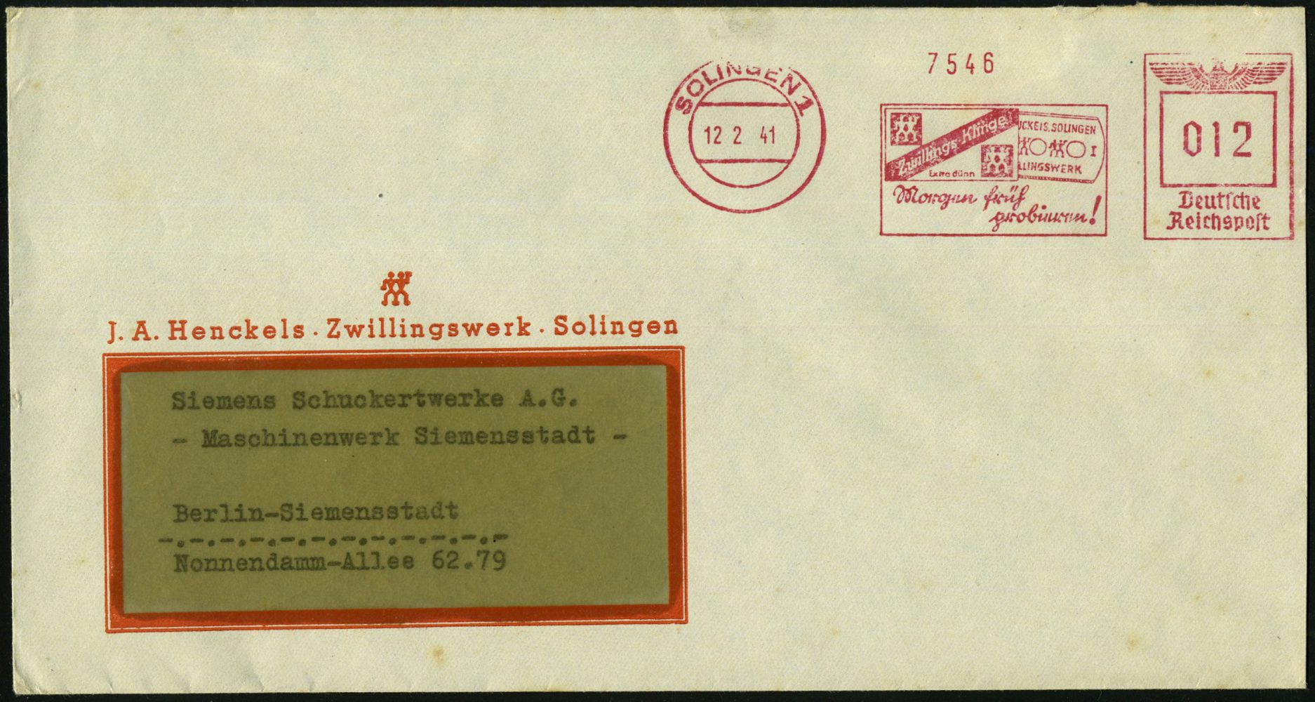 10423 | 18 € | 5650 SOLINGEN (Post- und Absender-Freistempel) : SOLINGEN 1/ Zwillings-Klinge/ ..Morgen früh/ probieren! 1941 (12.2.) AFS Francotyp "Reichsadler" = Rasierklinge (u. 2x Firmenlogo), Text teils Sütterlin (rs. Klappenriß) klar gest. Firmen-Bf. mit Firmenlogo (Dü.E-5CGh) | ![]() | |