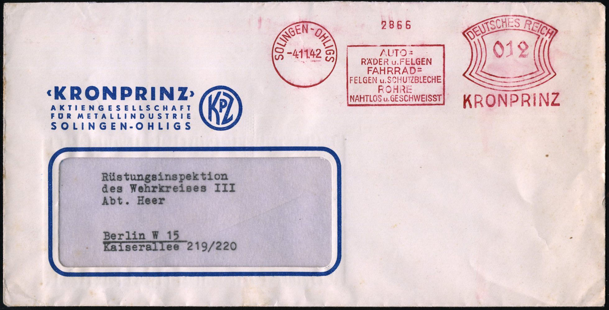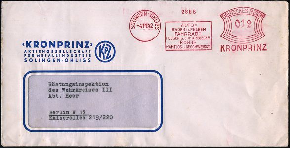 10424 | 18 € | 5650 SOLINGEN (Post- und Absender-Freistempel) : SOLINGEN-OHLIGS/ AUTO-/ RÄDER u.FELGEN/ FAHRRAD-/ FELGEN u.SCHUTZBLECHE../ KRONPRINZ 1942 (4.11.) AFS Francotyp "Bogenrechteck" o h n e Monogr.-Logo = aptiert , Firmen-Bf.: Kronprinz-AG.. (Logo: KPZ) Fernbf., = Wehrmachts-Lieferant! (Dü.E-1BAh) | ![]() | |