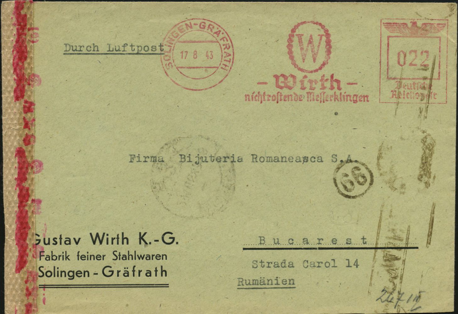 10426 | 28 € | 5650 SOLINGEN (Post- und Absender-Freistempel) : SOLINGEN-GRÄFRATH/ Wirth/ nichtrostende Messerklingen 1943 (17.8.) AFS 022 Pf. (Logo) + roter Band-Zensur-MaSt. (= Wien, Rie.G-27) + neutraler Streifen, Ausl.-Zensur-Flp.-Bf. n.Bukarest = Europa-(Inlands)-Tarif! (Dü.E-5CG) | ![]() ![]() | |