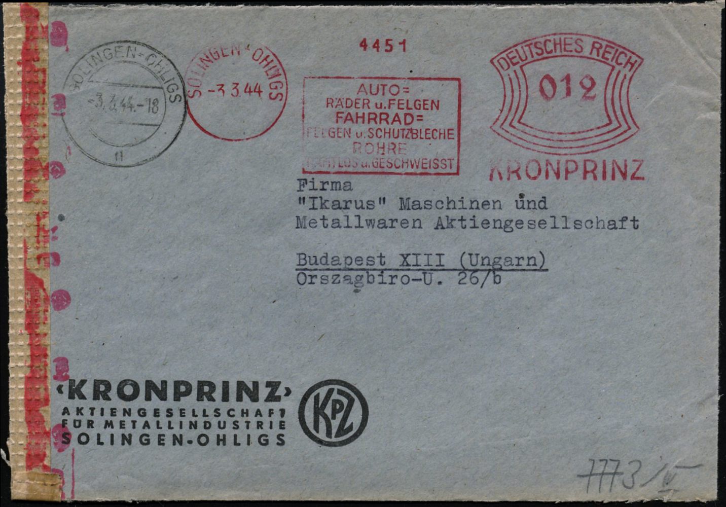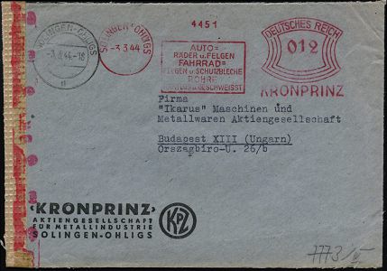 10427 | 25 € | 5650 SOLINGEN (Post- und Absender-Freistempel) : SOLINGEN-OHLIGS/ AUTO-/ RÄDER u.FELGEN/ FAHRRAD-/ FELGEN u.SCHUTZBLECHE../ KRONPRINZ 1944 (3.3.) AFS Francotyp "Bogenrechteck" 012 Pf. + 2K-Steg: SOLINGEN-OHLIGS/n + roter OKW-Bd.-ZensurSt "g" (= Wien) + neutraler Streifen, Firmen-Bf.: KRONPRINZ AG.., seltener Ausl.-Zensur-Bf., = Inlands-Europa-Tarif! (Dü.E-1BAh) | ![]() | |