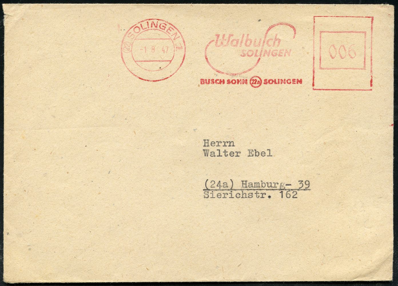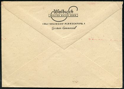10431 | 20 € | 5650 SOLINGEN (Post- und Absender-Freistempel) : (22) SOLINGEN 1/ Walbusch/ BUSCH SOHN (22a) SOLINGEN 1947 (1.8.) aptierter AFS Francotyp "Reichsadler" = entfernt + Inschrift "Deutsche/ Reichspost" = Notmaßnahme! (2 verschied. Variationen PLGZ) rs. Abs.-Vordruck, Fernbf. (Dü.E-13 AK-127o) | ![]() ![]() | |