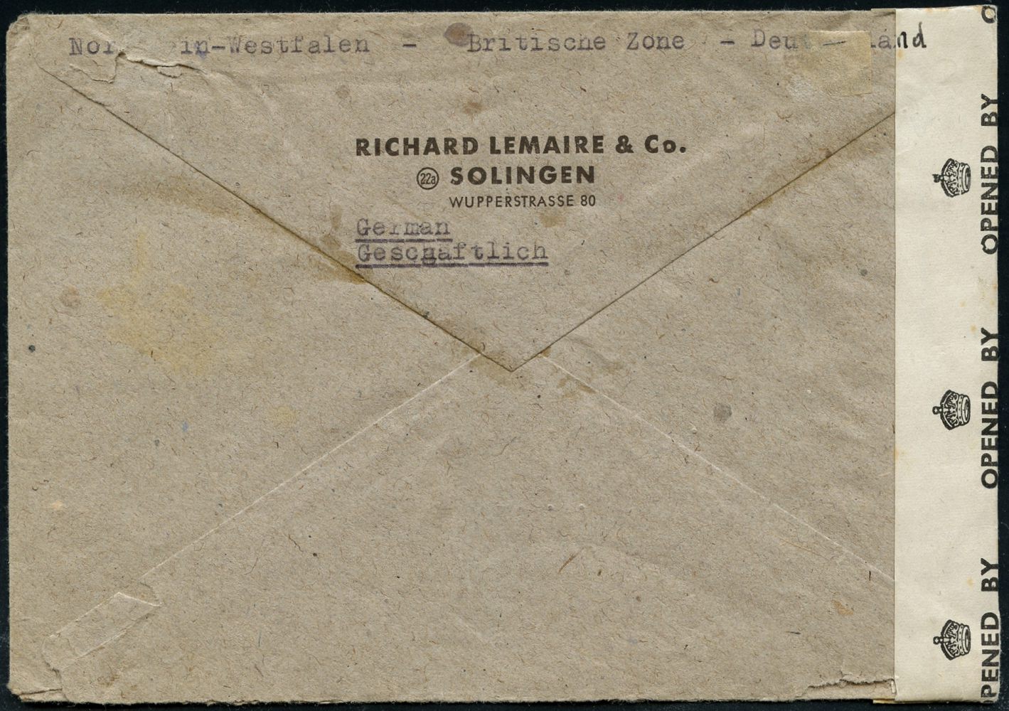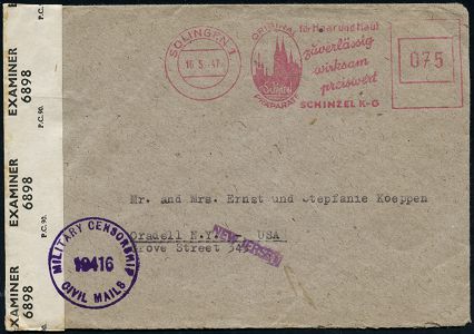 10432 | 35 € | 5650 SOLINGEN (Post- und Absender-Freistempel) : SOLINGEN 1/ ORIGINAL/ Schinzel/ PRÄPARATE/ für Haar u.Haut../ SCHINZEL KG 1947 (16.5.) aptierter AFS Francotyp "Reichsadler" = entfernt + Inschrift "Deutsches Reich" = Notmaßnahme 075 Pf. (Kirche) + brit. Zensurstreifen: OPENED BY/EXAMINER/6898 + viol. 1K: MILITARY CENSORSHIP/19416/CIVIL MAILS (= Bonn) Übersee-Zensur-Bf. n. U.S.A., viol. 1L: NEW JERSEY, seltene Destination! (Dü.E-13AK-129o) | ![]() ![]() | |