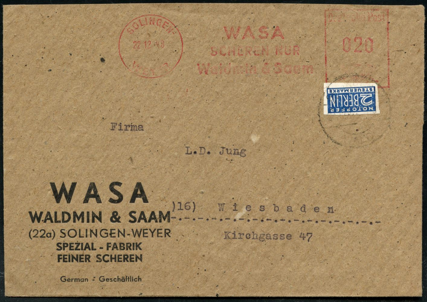 10437 | 16 € | 5650 SOLINGEN (Post- und Absender-Freistempel) : SOLINGEN-/ WALD/ WASA/ SCHEREN NUR/ Waldmin & Saam 1948 (30.11.) AFS Francotyp "Posthron" + ungez. 2 Pf. NoB , rs. dekorative Scheren-Reklame!, Fern-Bf. (Dp.E-20CG) | ![]() ![]() | |