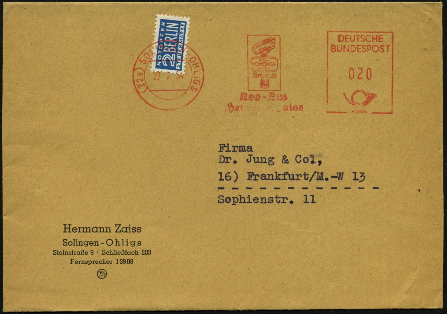 10446 | 14 € | 5650 SOLINGEN (Post- und Absender-Freistempel) : (22a) SOLINGEN-OHLIGS/ Neo-Ras/ Hermann Zaiss 1954 (27.7.) AFS Postalia "Posthorn" = Nass-Rasierapparate u. Klinge auf gez. 2 Pf. NoB (= Vorausentwertung) Firmen-Bf. (Dü.E-23B) | ![]() ![]() | |