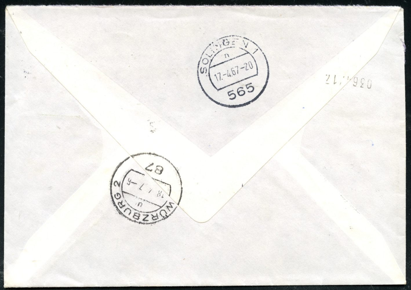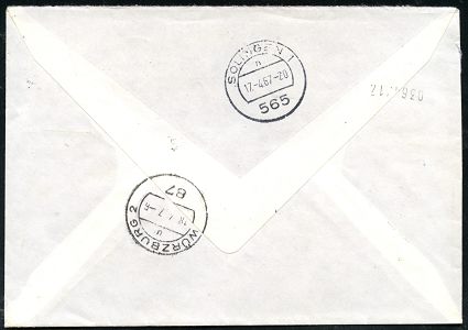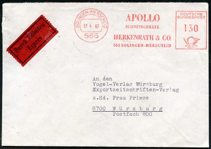 10453 | 16 € | 5650 SOLINGEN (Post- und Absender-Freistempel) : 565 SOLINGEN-MERSCHEID/ A P O L L O / SCHNEIDEGERÄTE/ HERKENRATH & CO 1967 (17.4.) AFS Francotyp 130 Pf. auf Fern-Eil-Brief (kl. Randkerne geschl.) n. Würzburg, rs. div. TS/AS., seltene Portostufe (Dü.E-23CG) | ![]() ![]() | |
