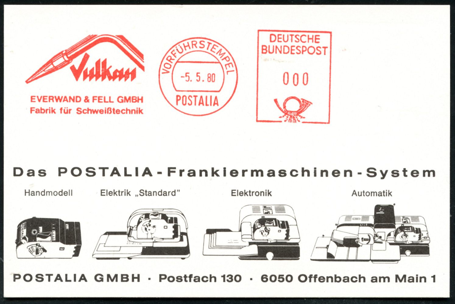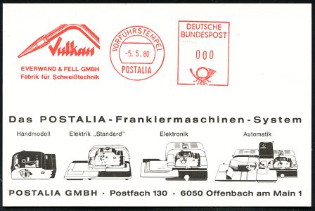 10454 | 18 € | 5650 SOLINGEN (Post- und Absender-Freistempel) : Solingen 1980 (5.5.) AFS: VORFÜHRSTEMPEL/POSTALIA/Vulkan/EVERWAND & FELL GMBH/..Schweißtechnik (Schweiß-gerät) seltene Postalia-Musterkt. (= Firmensitz: Solingen) | ![]() | |