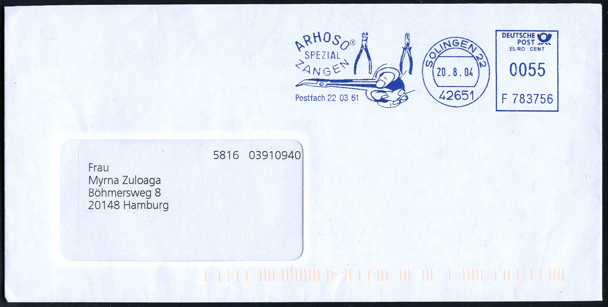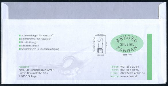 10456 | 10 € | 5650 SOLINGEN (Post- und Absender-Freistempel) : 42651 SOLINGEN 22/ ARHOSO/ SPEZIAL/ ZANGEN.. 2004 (20.8.) blauer AFS Francotyp mit Kennung (Hand mit Zange, 2 Zangen u. (R) im Kreis) Inl.-Bf. | ![]() ![]() | |