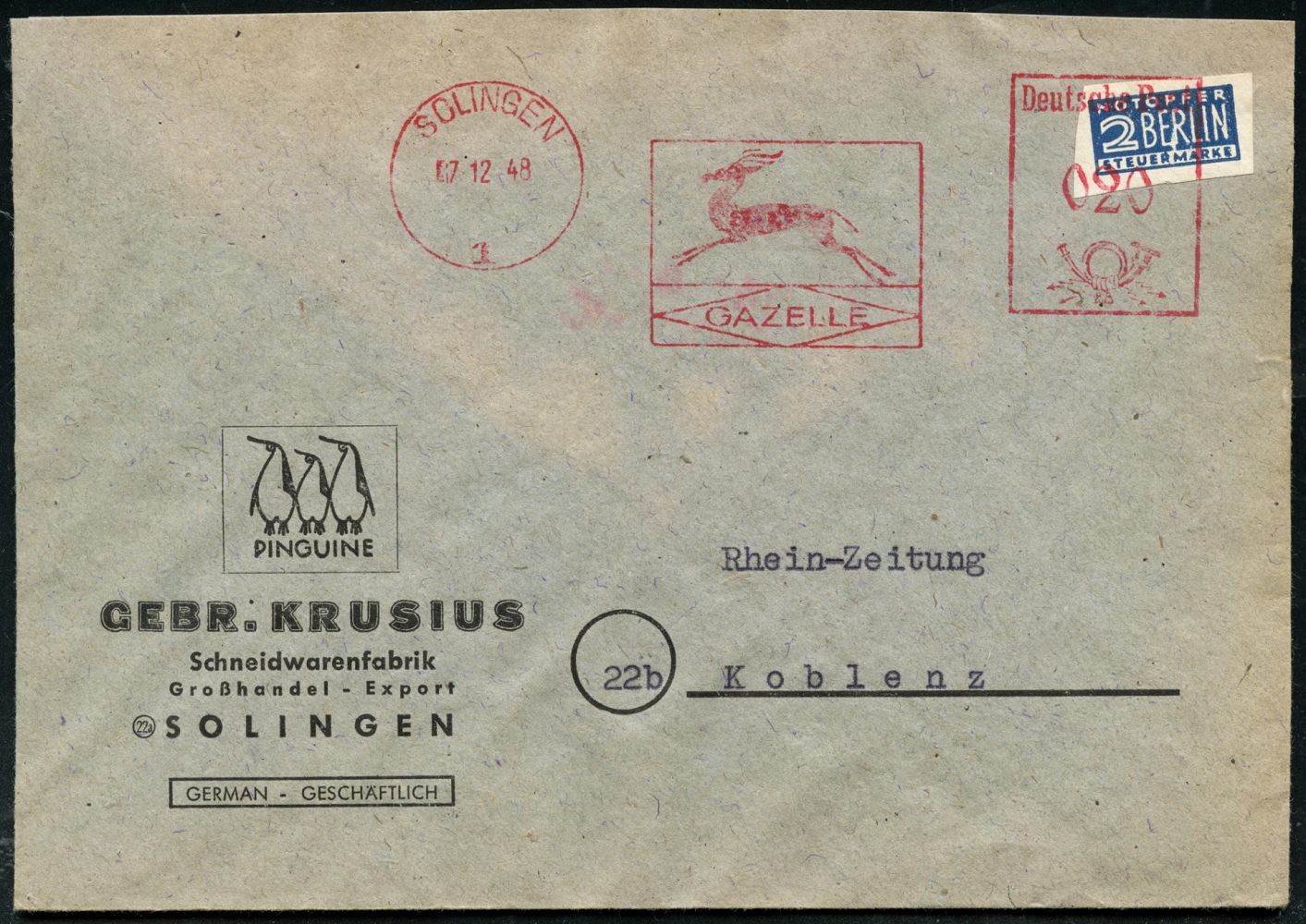 10438 | 18 € | 5650 SOLINGEN (Post- und Absender-Freistempel) : SOLINGEN 1/ GAZELLE 1948 (7.12.) AFS Francotyp "Posthorn" = Gazelle auf ungez. 2 Pf. NoB (= Vorausentwertung) Firmen-Bf. (etw. unfrisch): GEBR. KRUSIUS, Schneidewarenfabrik.. mit 3 Pinguinen (Dü.E-20CEo) | ![]() | |