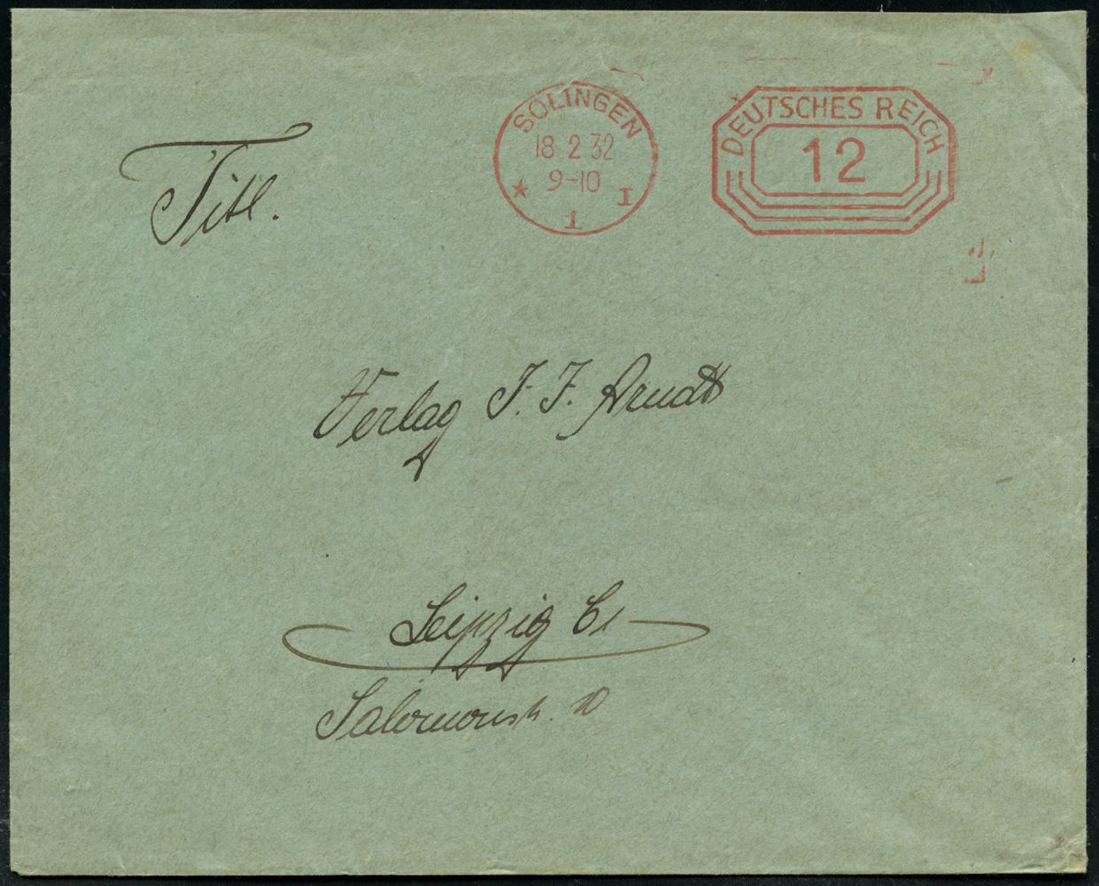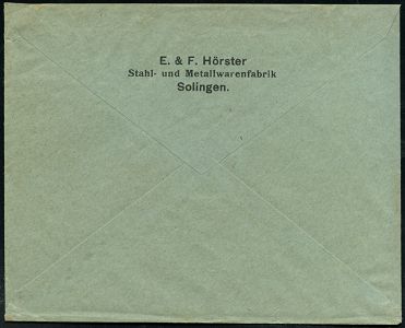 10413 | 12 € | 5650 SOLINGEN (Post- und Absender-Freistempel) : SOLINGEN/ * 1 I/ DEUTSCHES REICH 1932 (18.2.) PFS "Achteck" 12 Pf. = Briefporto! , Firmen-Drs.-Bf., rs. Abs.: E & F. Hörster, Stahl- u. Metallwarenfabrik (Dü.D-4) | ![]() ![]() | |