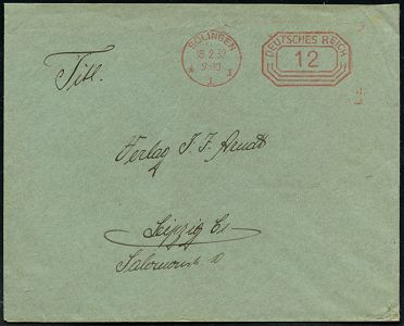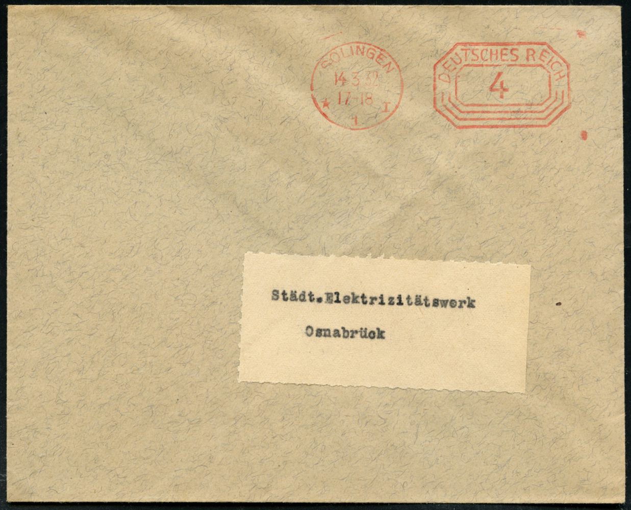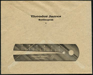 10414 | 15 € | 5650 SOLINGEN (Post- und Absender-Freistempel) : SOLINGEN/ * 1 I/ DEUTSCHES REICH 1932 (14.3.) PFS "Achteck" 4 (Pf.) , Reklame-Bf.: Theodor Jarres, rs. Messlehre (Dü.D-4) | ![]() ![]() | |