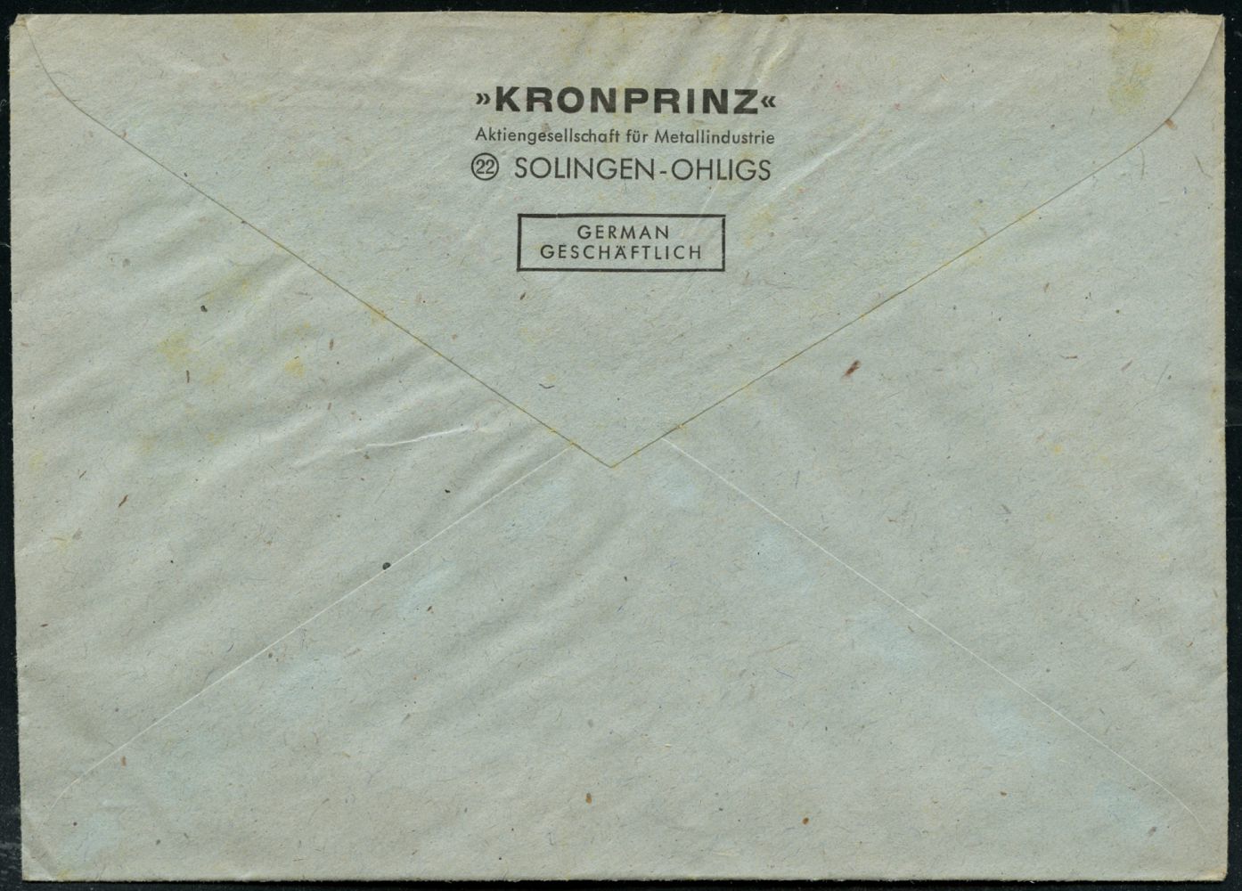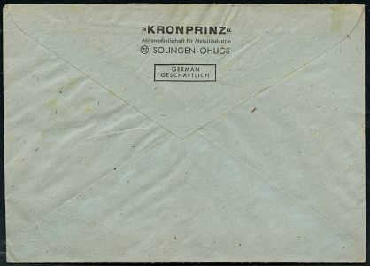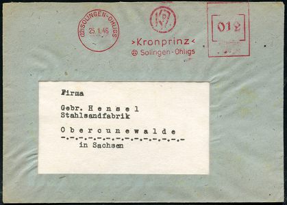 10429 | 20 € | 5650 SOLINGEN (Post- und Absender-Freistempel) : (22) SOLINGEN-OHLIGS/ KPZ/ ´Kronprinz´.. 1946 (25.1.) aptierter AFS Francotyp "Reichsadler" = entfernt = Notmaßnahme! (Monogr.-Logo) rs. Abs.-Vordruck: "KRONPRINZ" AG für Metallindustrie.., Fern-Bf. (Dü.E-13 Ak-122o) | ![]() ![]() | |