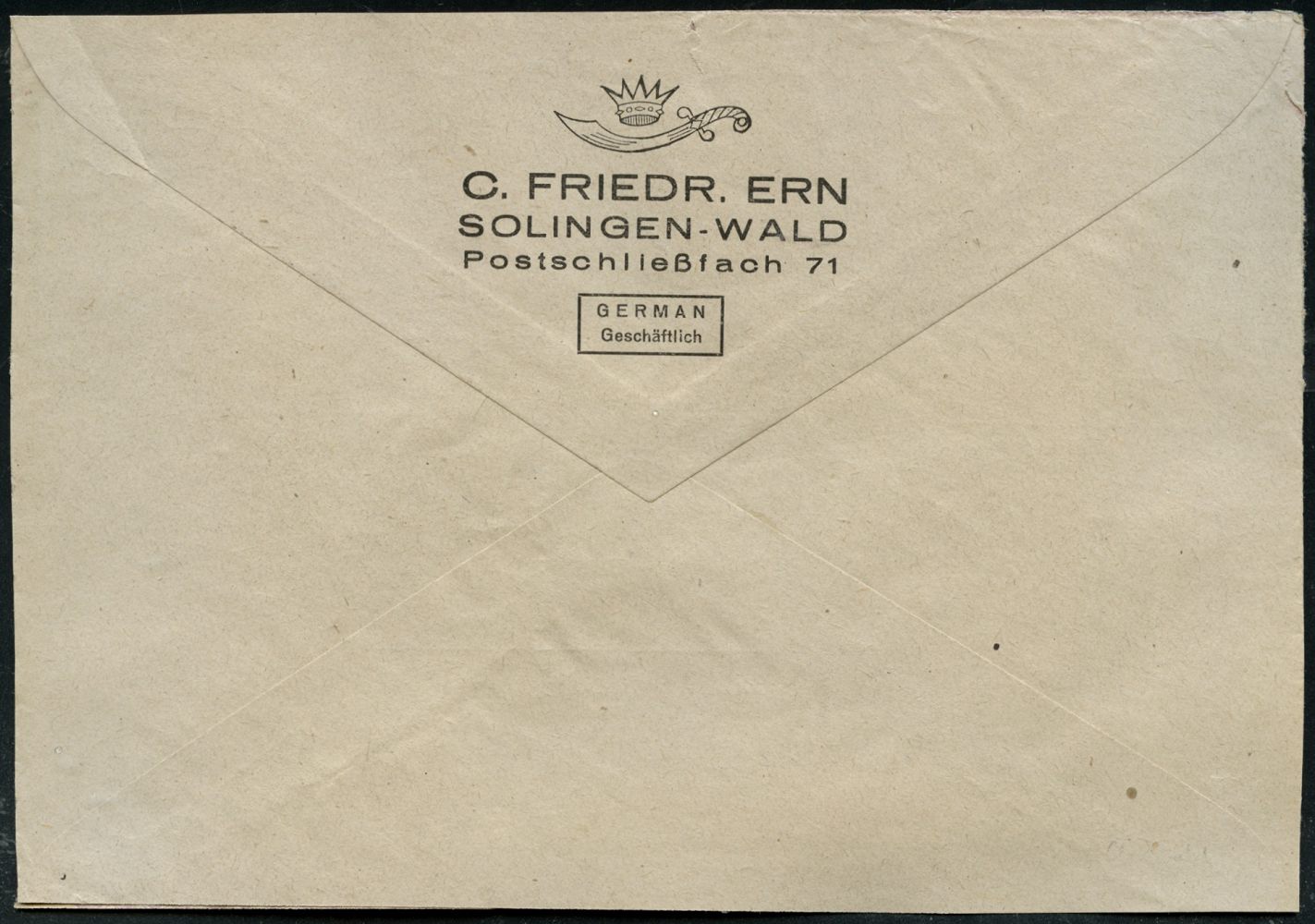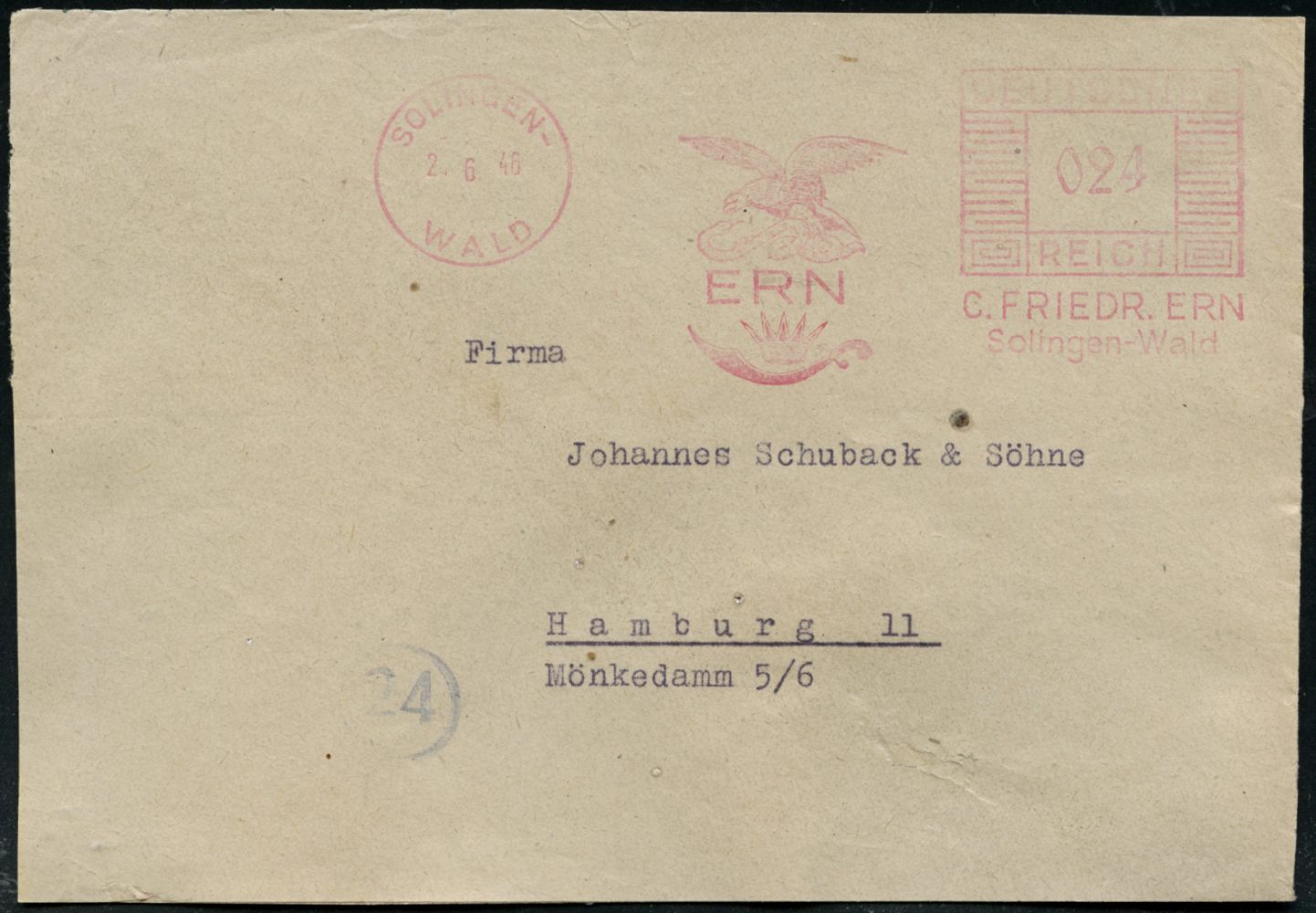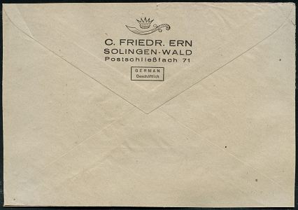 10430 | 20 € | 5650 SOLINGEN (Post- und Absender-Freistempel) : SOLINGEN-/ WALD/ ERN/ C.FRIEDR.ERN.. 1946 (2.6.) AFS Francotyp "Mäanderrechteck" u n v e r ä n d e r t weiterverwendet mit Inschrift "DEUTSCHES REICH" (Adler-Logo u. Krummschwert) rs. motiv-ähnl. Abs.-Vordruck (Mittelerbe geschl.), Fern-Bf. (Dü.E-2CEo, unverändert) | ![]() ![]() | |