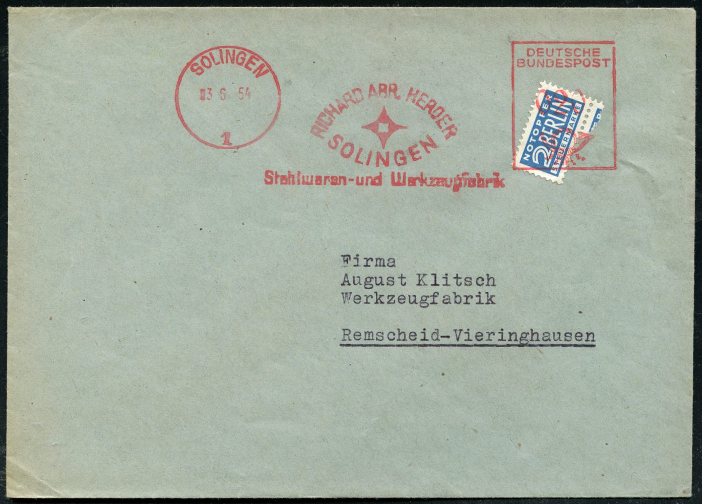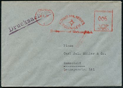 10444 | 15 € | 5650 SOLINGEN (Post- und Absender-Freistempel) : SOLINGEN/ 1/ RICHARD ABR.HERDER/ ..Stahlwaren-u.Werkzeugfabrik 1954 (3.6.) AFS Francotyp "Posthorn" mit Inschrift "DEUTSCHE BUNDESPOST" auf gez. 2 Pf. NoB (= Vorausentwertung) rs. Abs.-Vordruck, Fern-Bf., vergl. Kat.-Nr. 10440 (Dü.E-23CEo) | ![]() | |
