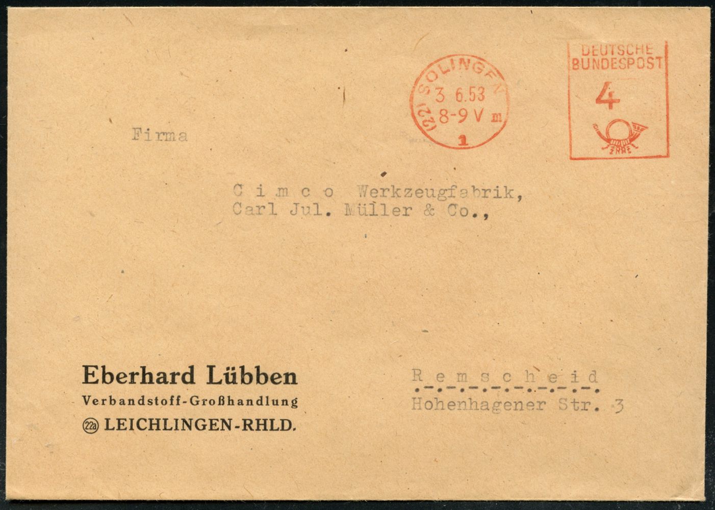 10445 | 8 € | 5650 SOLINGEN (Post- und Absender-Freistempel) : (22) SOLINGEN/ 1/ III/ DEUTSCHE/ BUNDESPOST 1953 (3.6.) PFS Hochrechteck "Posthorn" 4 (Pf.) auf Firmen-Bf.: Eberhard Lübben, Verbandsstoff-Großhandlung (Dü.D-17) | ![]() | |
