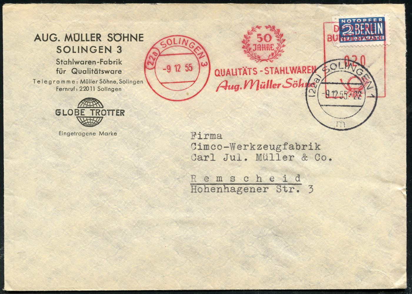 10447 | 16 € | 5650 SOLINGEN (Post- und Absender-Freistempel) : (22a) SOLINGEN 3/ 50 JAHRE/ QUALITÄTS-STAHLWAREN/ Aug.Müller Söhne 1955 (9.12.) Jubil.-AFS Postalia "Posthorn" auf 2 Pf. NoB (= Vorausentwertung) + 2K-Steg: (22 a) SOLINGEN 1/m, Firmen-Bf. (Dü.E-23 B) | ![]() | |