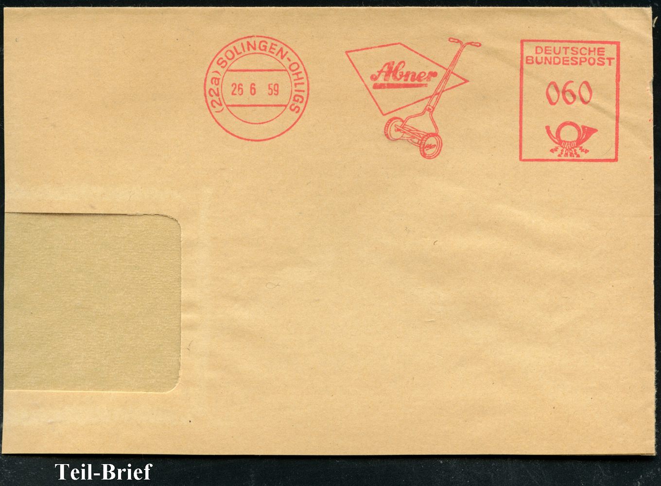 10448 | 10 € | 5650 SOLINGEN (Post- und Absender-Freistempel) : (22a) SOLINGEN-OHLIGS/ Abner 1959 (26.6.) AFS Francotyp 060 Pf. (Hand-Rasenmäher) glasklar auf Teil-Bf. (Dü.E-23CO) | ![]() | |