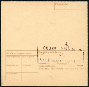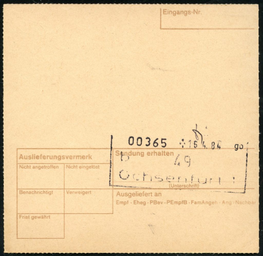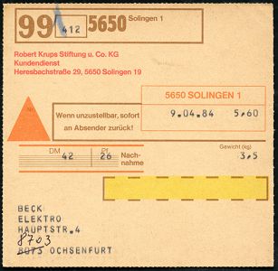 10455 | 10 € | 5650 SOLINGEN (Post- und Absender-Freistempel) : 5650 SOLINGEN 1 1984 (9.4.) EDV-Freistempel 5,60 DM (runde Ziffern) auf Inl.-NN-Selbstbucher-Paketkarte: Robert Krups Stiftung.. n. Ochsenfurt, rs. Paginier-AS.! | ![]() ![]() | |