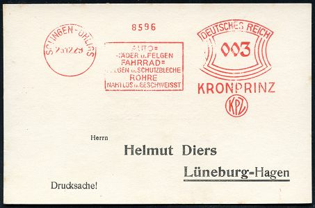 10412 | 18 € | 5650 SOLINGEN (Post- und Absender-Freistempel) : SOLINGEN-OHLIGS/ AUTO-/ RÄDER u.FELGEN/ FAHRRAD-/ FELGEN u.Schutzbleche../ KRONPRINZ/ KPZ 1929 (23.12.) AFS Francotyp "Bogenrechteck" mit Firmen-Monogr.-Logo "K P Z" , Inl.-Drs.-Karte, vergl. Los Nr. 5182 u. 5194 (Dü.E-1BAh) | ![]() | |