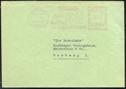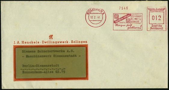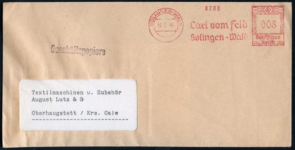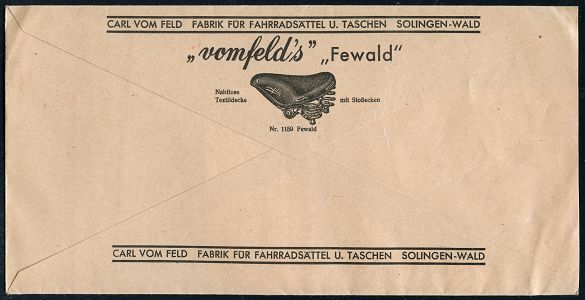 10425 | 18 € | 5650 SOLINGEN (Post- und Absender-Freistempel) : SOLINGEN-WALD/ Carl vom Feld 1942 (12.2.) AFS Francotyp "Hakenkreuz" auf Reklame-Bf.: "vomfelds" "Fewald" = Fahrrad-Sattel, rs. Reklame (= Fabrik für Fahrradsättel u.-Taschen) Inl.-Bf., = Wehrmachts-Lieferant! (Dü.E-3CEh) | ![]() ![]() | |