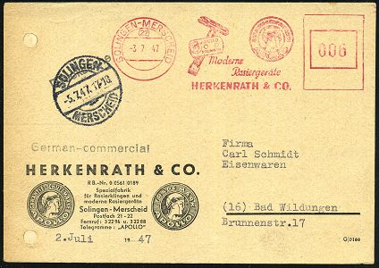 10433 | 20 € | 5650 SOLINGEN (Post- und Absender-Freistempel) : (22) SOLINGEN-MERSCHEID/ APOLLO../ Moderne Rasiergeräte/ HERKENRATH & CO 1947 (3.7.) aptierter AFS Francotyp "Reichsadler" = entfernt + Inschrift "Deutsches Reich" entfernt = Naß-Rasier-Apparat u. Kopf des Apollo (Reg.-Lochung links geschl.) motiv-ähnl. Firmen-Kt. (Apollo) n. Bad Wildungen (Dü.E-13E-113o) | ![]() | |