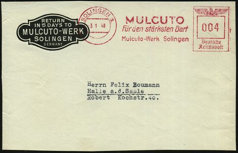 10428 | 16 € | 5650 SOLINGEN (Post- und Absender-Freistempel) : SOLINGEN 1/ MULCUTO/ Für den stärksten Bart/ Mulcuto-Werk.. 1940 (3.1.) AFS Francotyp "Reichsadler" klar auf Firmen-Vorderseite (Dü.E-5CGo) | ![]() | |