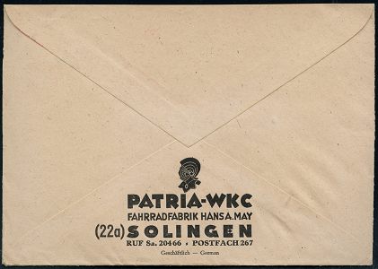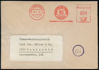 10436 | 18 € | 5650 SOLINGEN (Post- und Absender-Freistempel) : (22a) SOLINGEN 1/ PATRIA-WKC/ FAHRRÄDER - MOTORFAHRRÄDER 1948 (30.7.) AFS Francotyp "Posthorn" (Logo = Helm eines römischen Gladiators) rs. motivgl. Firmen-Logo, Fern-Bf. (Dü.E-20CG) | ![]() ![]() | |