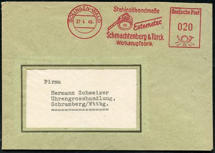 10439 | 16 € | 5650 SOLINGEN (Post- und Absender-Freistempel) : SOLINGEN-WALD/ Stahlrollbandmaße/ Estemeter/ Schmachtenberg & Türck 1948 (22.10.) AFS Francotyp "Posthorn" = Metall-Rollbandmaß klar auf Fernbf. (Dü.E-20CG) | ![]() | |