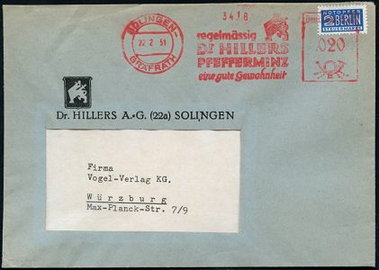 10441 | 15 € | 5650 SOLINGEN (Post- und Absender-Freistempel) : SOLINGEN-/ GRÄFRATH/ regelmässig/ Dr.HILLERS/ PFEFFERMINZ/ eine gute Gewohnheit 1951 (22.2.) AFS Francotyp "Posthorn" (Logo: Tier mit Schwert im Rücken) auf gez. 2 Pf. NoB (= Vorausentwertung) motivgl. Firmen-Bf. (Dü.E-20CEh/Lj.) | ![]() | |