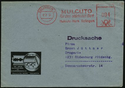 10442 | 16 € | 5650 SOLINGEN (Post- und Absender-Freistempel) : SOLINGEN 1/ MULCUTO/ für den stärksten Bart/ Mulcuto-Werk.. 1951 (2.2.) AFS Francotyp "Posthorn" auf Reklame-Bf.: DIE NEUE RASIERKLINGE.. (Dü.E-20CG = Letztjahr) | ![]() | |