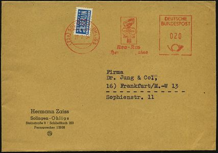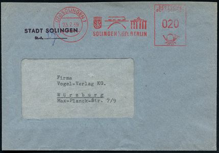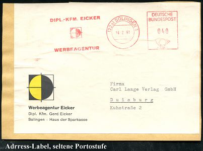 10450 | 16 € | 5650 SOLINGEN (Post- und Absender-Freistempel) : (22a) SOLINGEN 1/ DIPL.-KFM.EICKER/ WERBEAGENTUR 1961 (14.2.) AFS Postalia 040 Pf. auf zweifarbigem Firmen-Label: Werbeagentur Eicker.. mit Logo, seltene Portostufe (Dü.E-26 B) | ![]() | |