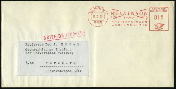 10451 | 15 € | 5650 SOLINGEN (Post- und Absender-Freistempel) : 565 SOLINGEN 1/ WILKINSON/ SWORD/ RASIERKLINGEN.. 1965 (26.2.) AFS Francotyp = 2 gekreuzte Säbel, 015 Pf. , rs. motivgl.Reklame!, Firmen-Bf. "BRIEF-DRUCKSACHE" (Dü.E-23CGo) | ![]() ![]() | |