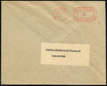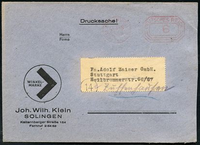 10434 | 18 € | 5650 SOLINGEN (Post- und Absender-Freistempel) : (22) SOLINGEN/ 1/ III/ DEUTSCHES REICH 1948 (12.3.) PFS "Achteck" mit PLGZ u. u n v e r ä n d e r t e m Wertrahmen, Inschrift "DEUTSCHES REICH" 6 (Pf.) = Notmaßnahme , Firmen-Drs.-Bf.: WINKEL-MARKE, Joh. Wilh. Klein.. (Dü.D-4, unverändert) | ![]() | |