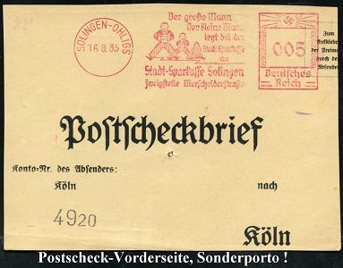 10415 | 18 € | 5650 SOLINGEN (Post- und Absender-Freistempel) : SOLINGEN-OHLIGS/ Der große Mann/ Der kleine Mann../ Stadt-Sparkasse Solingen.. 1935 (16.8.) AFS Francotyp "Hakenkreuz" 005 Pf. = Sondertarif ! (Mann, 2 Kinder mit Geldsäcken) kleine Postscheck-Vorderseite (PSch-Amt Köln) (Dü.E-3BAo) | ![]() | |