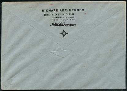10440 | 15 € | 5650 SOLINGEN (Post- und Absender-Freistempel) : SOLINGEN/ 1/ RICHARD ABR. HERDER../ Stahlwaren u. Werkzeugfabrik 1951 (30.1.) AFS Francotyp "Posthorn" (Firmenlogo) rs. Abs.-Vordruck: RICHARD ABR. HERDER.. "RAHSOL"-Werkzeuge (Dü.20CEo) | ![]() ![]() | |